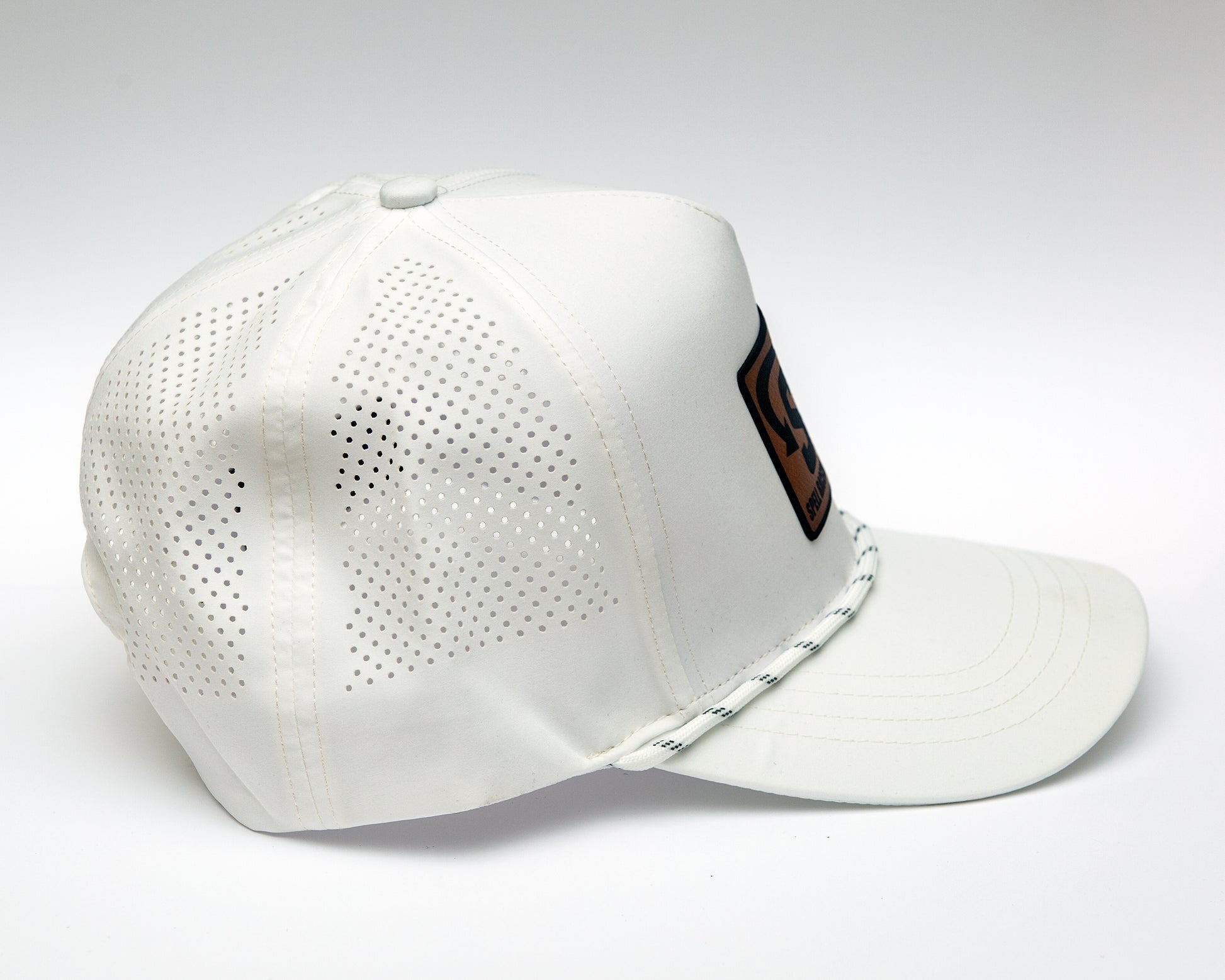 White hat with SRB logo on leather patch.